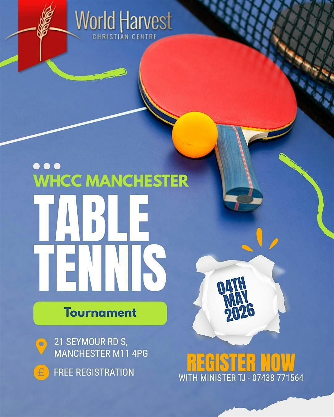 Get ready for an exciting and uplifting time at the World Harvest Table Tennis Tournament! Join us in person at World Harvest Christian Centre Manchester on May 4, 2026 at 12:00 PM (BST). This is more than just a tournament, it’s a great opportunity for fellowship, friendly competition, and building community in a positive, faith-filled atmosphere.