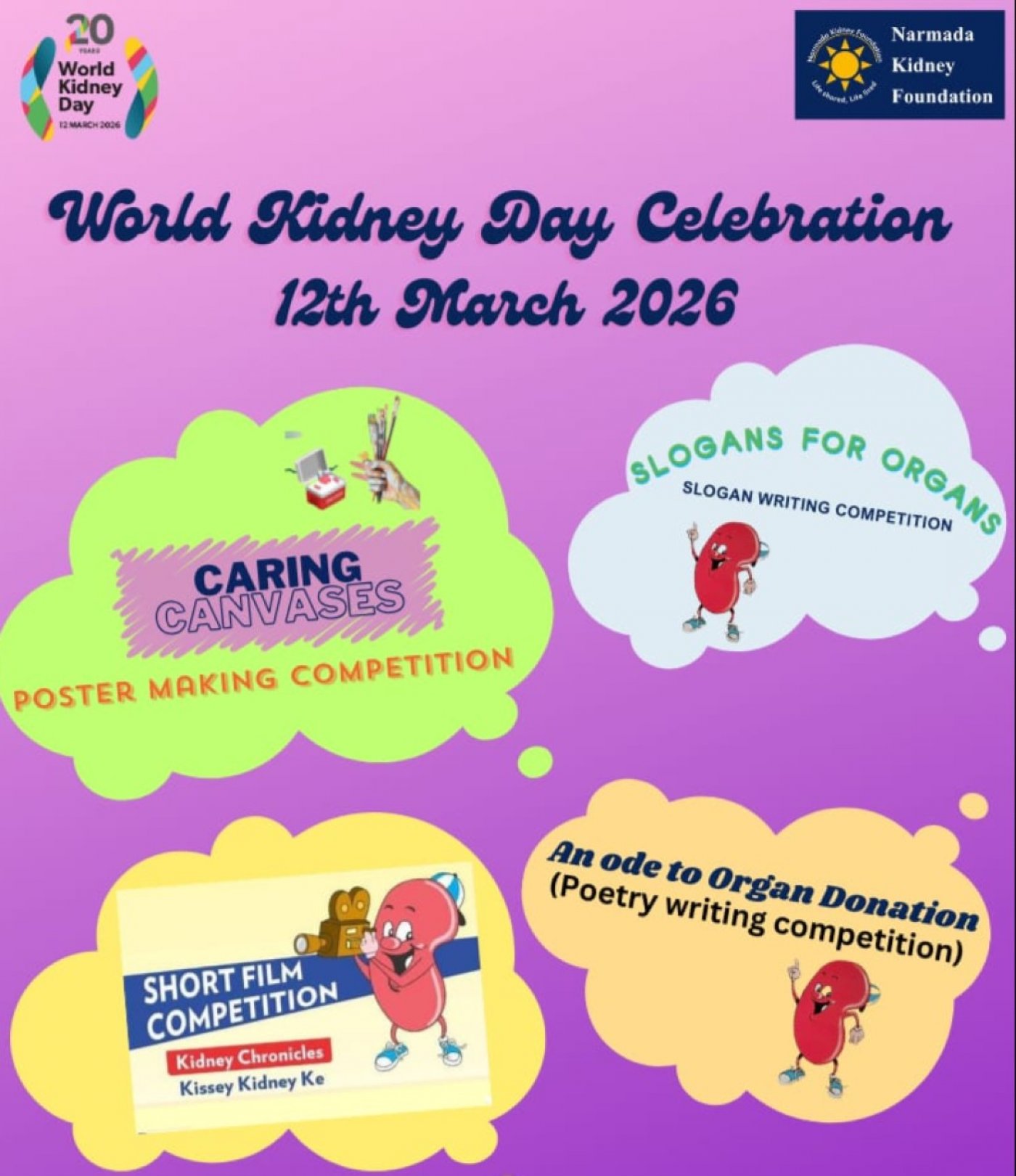Narmada Kidney Foundation celebrates World Kidney Day by organizing various competitions. The Competitions are open to all with a separate category for student participants. The entry to the competition is free of charge and offers a chance to raise social awareness while earning praise & prizes. This is the best opportunity for everyone to spread the message of Kidney Care and Organ Donation. All participants will receive a participation certificate.