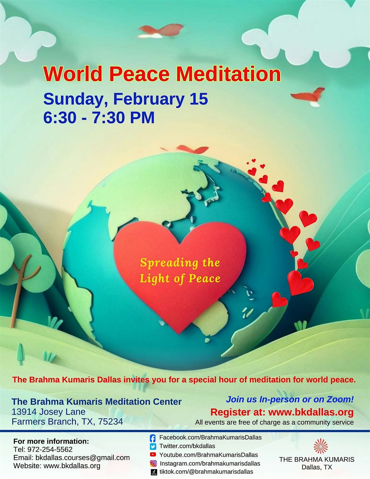 Join us for a special World Peace Meditation as we come together in stillness to spread the light of peace to ourselves and the world.