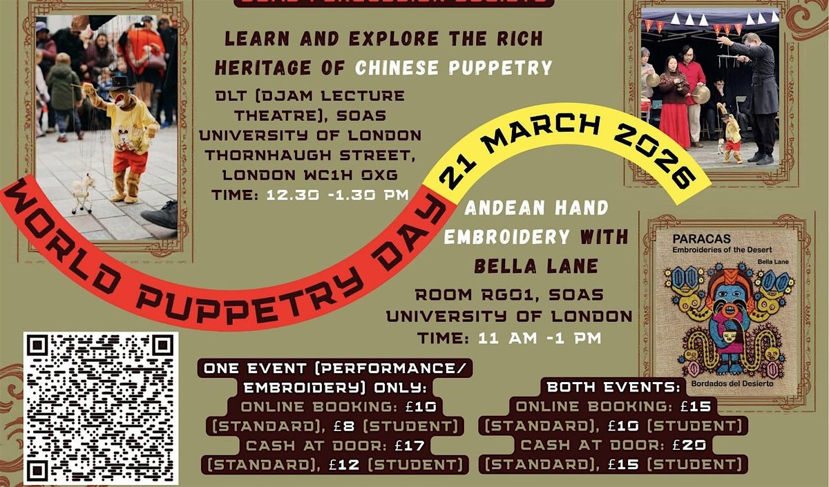 Join us for an amazing in-person celebration of World Puppetry Day. Master puppeteer Jose Navarro, accomapnied live by the SOAS SIlk and Bamboo Ensemble and SOAS Percussion Society, will take you into the magical world of puppets! Learn traditional Chinese puppetry and Andean hand embroidery with Bella Lane. Bring your friends and family for a fun-filled day full of exploring the rich heritage of Chinese and Andean cultures!