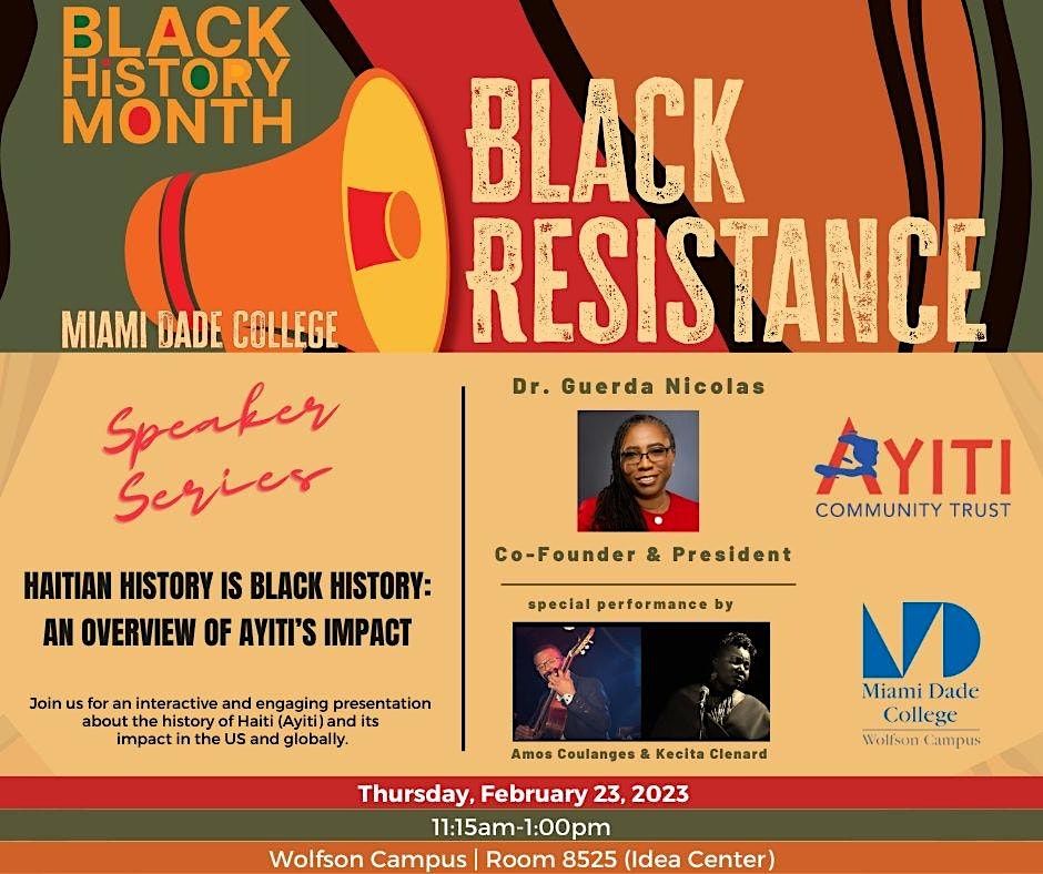 This performance is part of MDC’s Black History Month event, “Haitian History is Black History: An Overview of Ayiti’s Impact featuring Dr. Guerda Nicolas, Co-founder & President of Ayiti Community Trust.” Join us for an unforgettable interactive and engaging presentation about the history of Haiti (Ayiti) and its impact in the US and around the globe. The performance is sponsored by ENT surgeon Dr. Wilson DuMornay with special thanks to Miami Dade College President Beatriz Gonalez and Black History Month – Co Chair and celebrated Adjunct Faculty Dr. Tyra Madison.