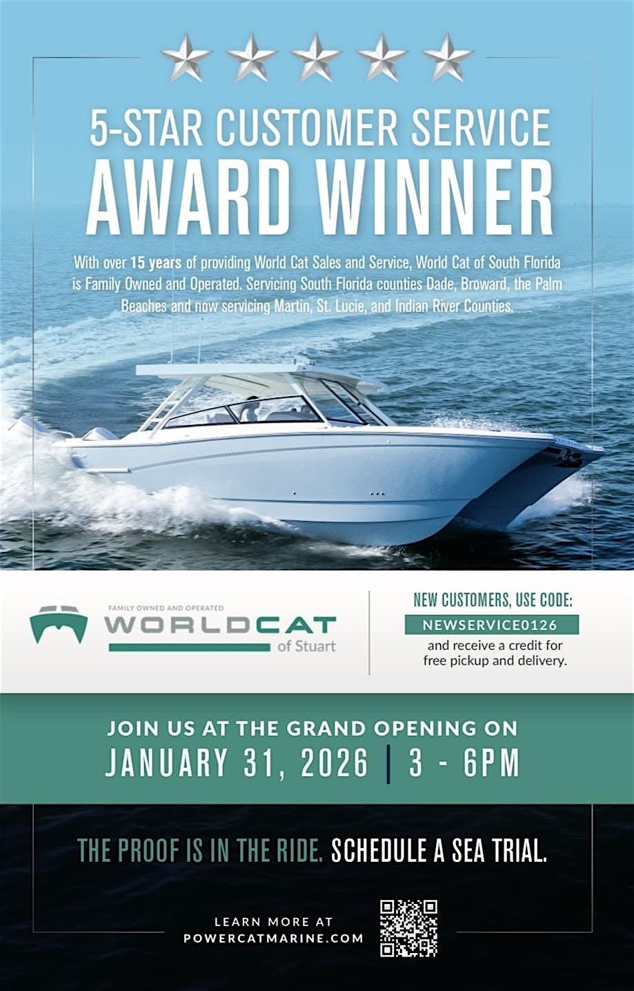 Join us in person for an exciting day as we celebrate the launch of WorldCat Of Stuart! Where we will have the best riding boats. It's going to be a fun-filled event with great food. vibes, cool people, and a chance to meet our sales staff and service tea. explore what we have in store for the community. Don't miss out on the big reveal and enjoy a memorable experience with us. See you there!