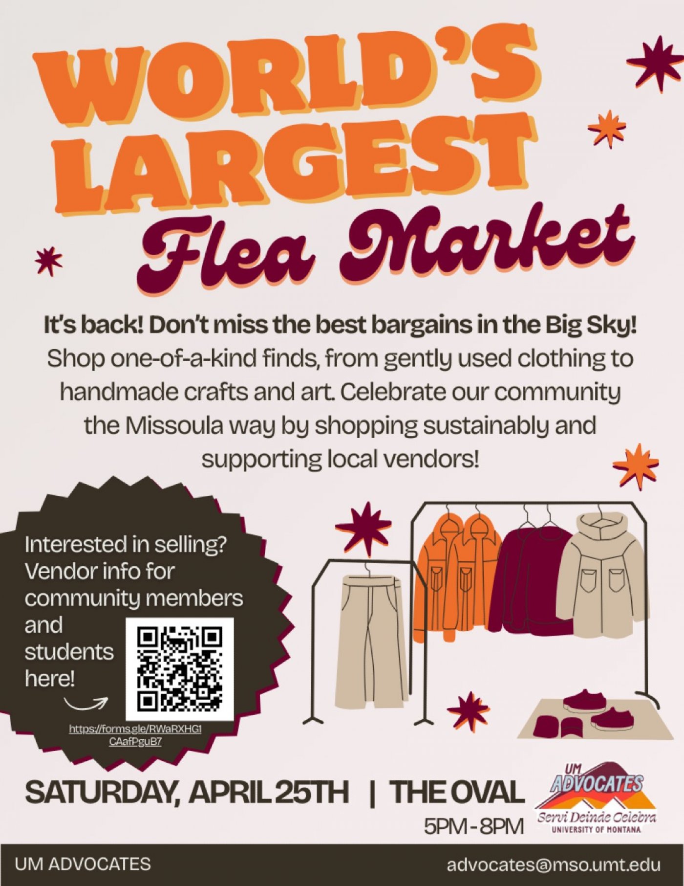 It’s back! Don’t miss the best bargains in the Big Sky! Shop one-of-a-kind finds, from gently used clothing to handmade crafts and art. Celebrate our community the Missoula way by shopping sustainably and supporting local vendors! (Interested in selling? Vendor info for community members and students here! https://forms.gle/RWaRXHG1CAafPguB7