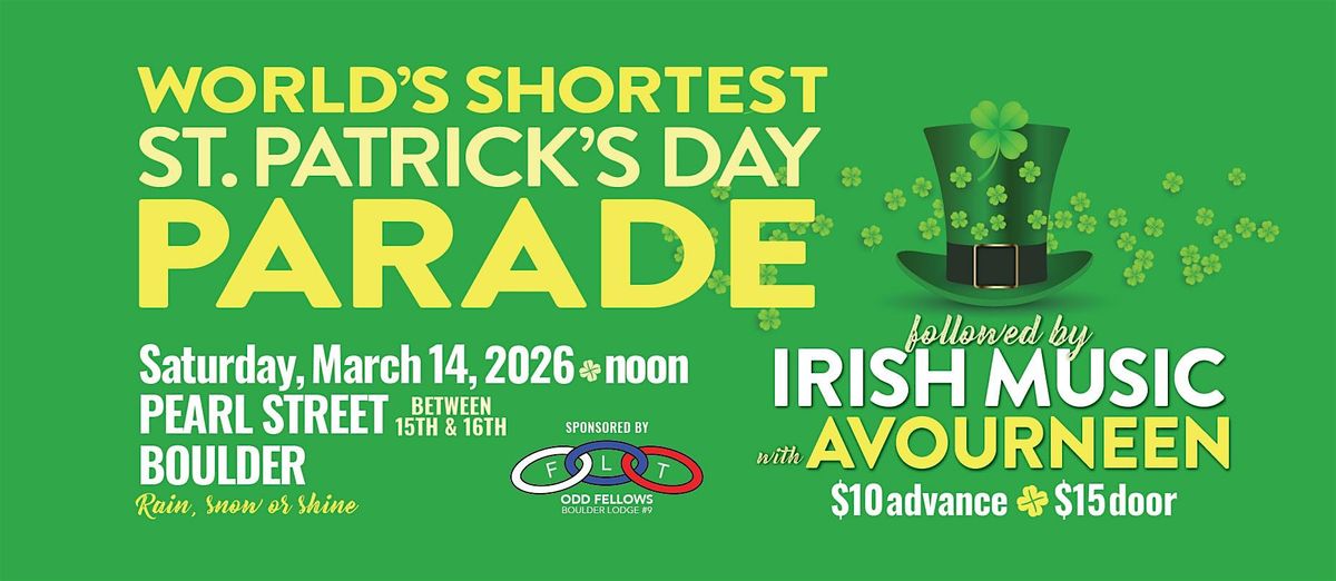 Join us for a good old-fashioned Irish hooley! The Independent Order of Odd Fellows is once again proud to host the World’s Shortest St. Patrick’s Day Parade & Fundraising After-Party on Saturday, March 14th, in the 1500 block of Pearl Street, Boulder.