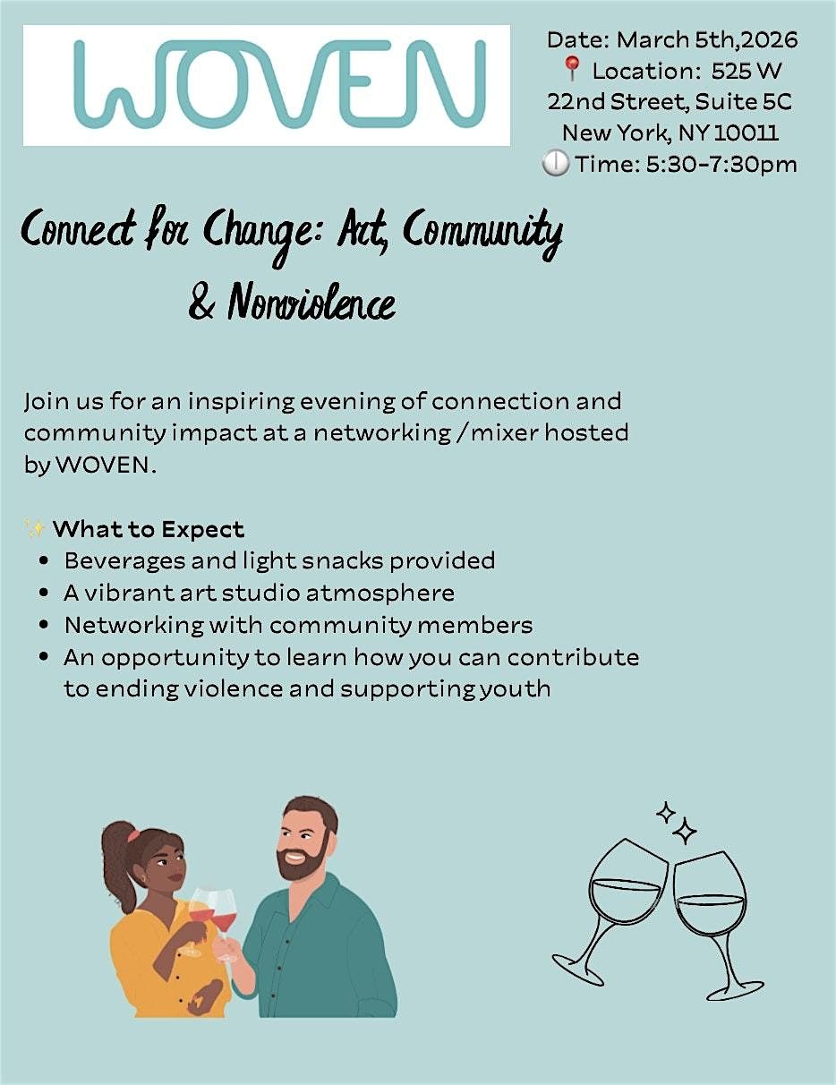 Hosted by WOVEN (We Oppose Violence Everywhere Now Based in New York), a 501(c)3 nonprofit organization supporting schools and communities through nonviolence, restorative practices, and art activism.