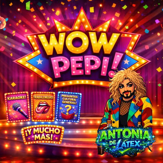 Qué vas a disfrutar 🌟 Una experiencia donde el escenario se convierte en tablero y el público en protagonista 🎵 Un juego, una fiesta, un espectáculo donde la risa, la música y la participación se entrelazan 🎉 Un planazo en un lugar muy especial, Espacio Hollywood Información 📅 Fecha y hora: selecciona la fecha y hora que quieras directamente en el selector de entradas 📍 Lugar: Espacio Hollywood, Madrid ⏳ Duración: aproximadamente 60 minutos 👤 Edad: todos los públicos - Los menores de 18 años tienen que venir acompañados de su padre, madre o tutor legal 👉 ¡Puedes pedir tu bebida favorita en la barra para disfrutar del show! Descripción ¡Bienvenides a Wow Pepi! Una experiencia donde el escenario se convierte en tablero y el público en protagonista. Este espectáculo interactivo es una celebración del ingenio, la música y el desenfado, donde cada asistente tiene la oportunidad de brillar. Desafíos de karaoke trabalenguas y preguntas ingeniosas, entre otros, son los retos que encenderán la energía de la sala y te transformará en parte esencial del espectáculo. Guiando esta fiesta se encuentra Antonia de Latex, maestra de ceremonias incomparable, cuya presencia magnética, carisma arrollador y afilado sentido del humor convierten cada momento en una explosión de glamour y cercanía. Un juego, una fiesta, un espectáculo donde la risa, la música y la participación se entrelazan para crear una experiencia única e irrepetible. ¡Consigue tus entradas para Wow Pepi en Espacio Hollywood, Madrid!