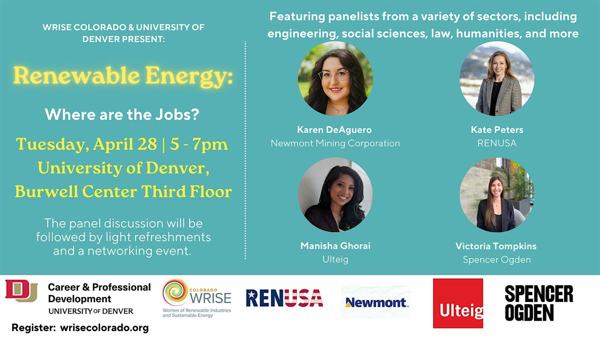 We have a great lineup of panelists who will talk about what kinds of jobs are available in renewable energy and how to set yourself up for success for a career in renewable energy. The panel is followed by a networking event with company reps and light refreshments.