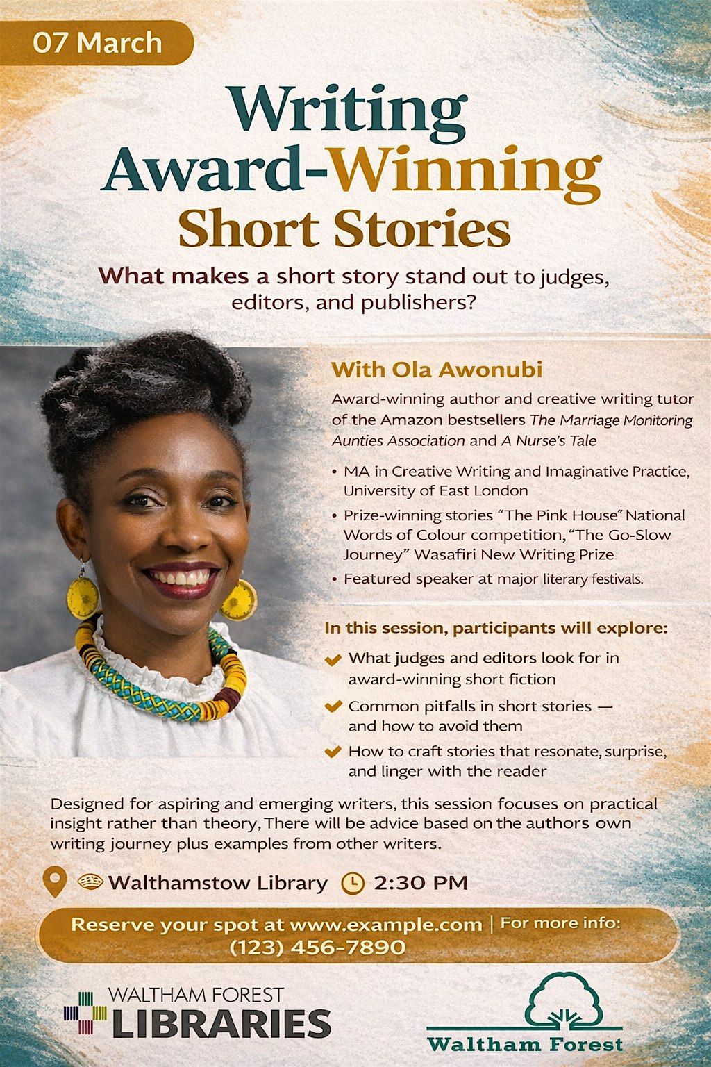 Join Ola Awonubi, award-winning author and creative writing tutor, for a focused and practical session on crafting short fiction that resonates. Ola is the author of the recent Amazon bestsellers The Marriage Monitoring Aunties Association and A Nurse’s Tale (One More Chapter Books, HarperCollins.
