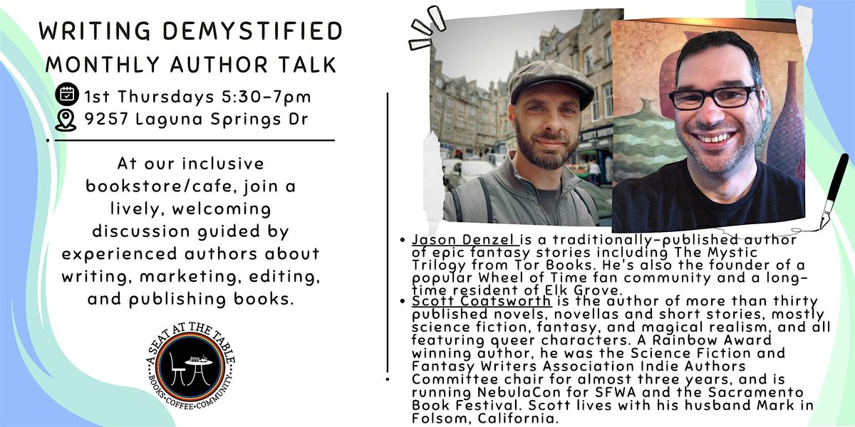 - Around our large table, chat with other writers about writing, marketing, editing, and publishing books in any genre and through any publishing method in a discussion guided by experienced writers Jason Denzel and Mark Steensland.