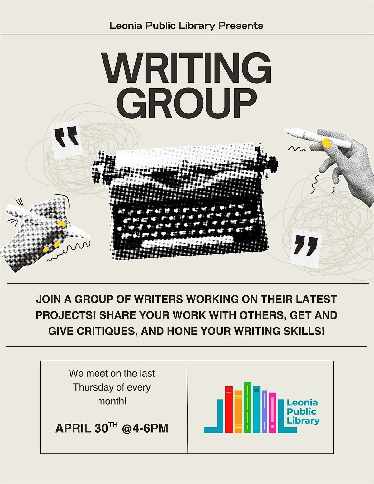 Hey there! Join us for a Writing Group session where you can share your stories, get feedback, and connect with fellow writers. It’s a relaxed, friendly space to boost your creativity and have fun putting words on the page.