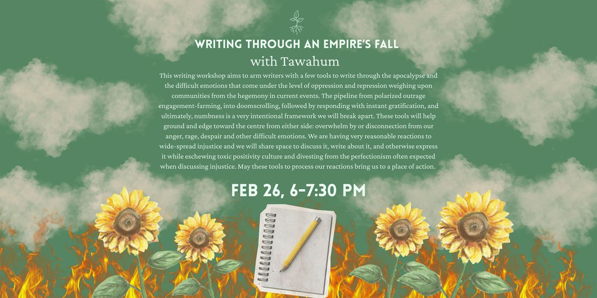 This workshop aims to arm writers with a few tools to write through the apocalypse and the difficult emotions that come under the level of oppression and repression weighing upon communities from the hegemony in current events. The pipeline from polarized outrage engagement-farming, into doomscrolling, followed by responding with instant gratification, and ultimately, numbness, is a very intentional framework we will break apart. These tools will help ground and edge toward the centre from either side: overwhelmed by or disconnected from our anger, rage, despair and other difficult emotions. We are having very reasonable reactions to widespread injustice, and we will share space to discuss it, write about it, and otherwise express it while eschewing toxic positivity culture and divesting from the perfectionism often expected when discussing injustice. May these tools to process our reactions bring us to a place of action.