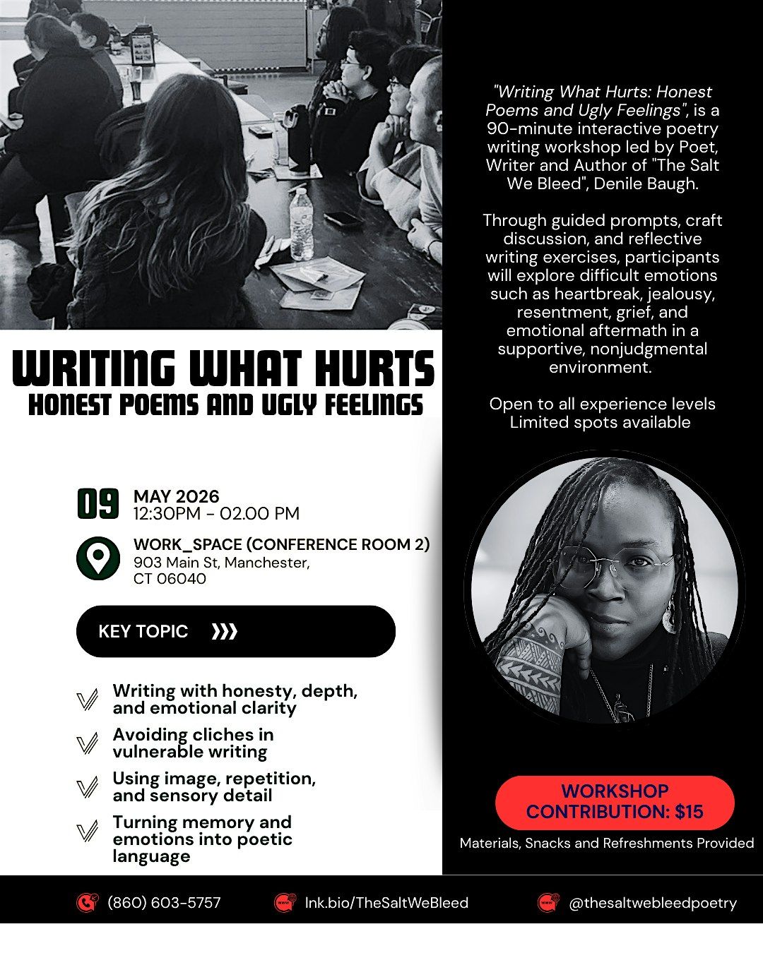Led by Denile Baugh (CT-Based Writer, Poet and Author of “The Salt We Bleed”), this session invites participants to write from heartbreak, envy, shame, resentment, regret, and emotional contradiction. In this workshop participates will write those feelings directly and artistically. Through short readings, practical craft tools, and layered prompts, writers will explore how difficult emotional material can become vivid, honest and insight poetry.