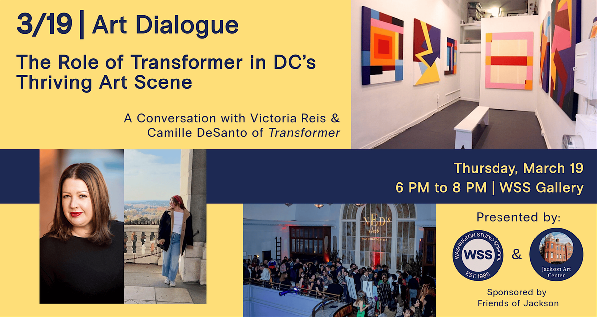 Jackson Art Center in partnership with Washington Studio School invite you to an engaging conversation with the leaders of , a cornerstone of the DC art scene since 2002. Co-Founder & Director Victoria Reis and Exhibitions & Programs Coordinator Camille DeSanto will dive into Transformer’s 20-year history of elevating emerging artists through global partnerships and innovative exhibitions. Discover how they’ve helped shape the local creative landscape, how collectors are finding new talent at their events, and what’s next for the organization’s exciting future.