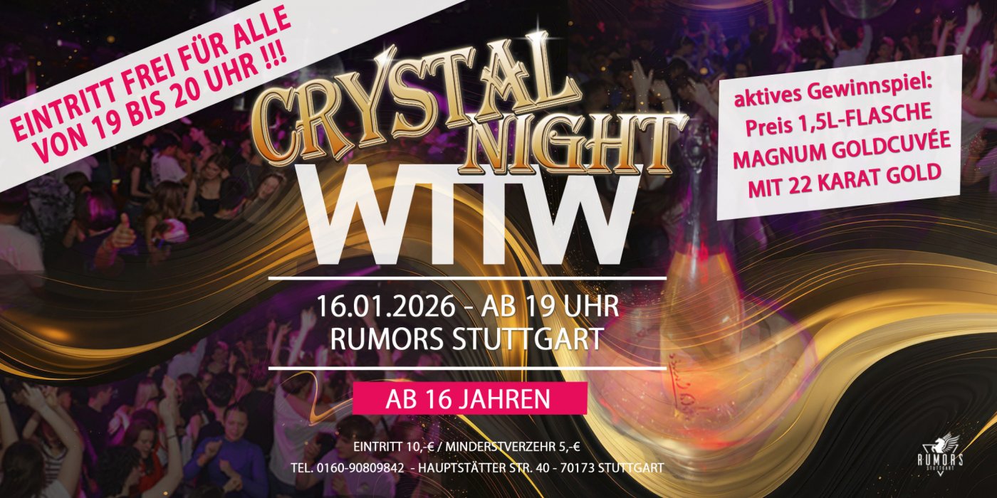 🥇 WTTW@RUMORS ist ja bekannt für seine abwechslungsreichen und ausgefallenen Motto-Partys. Die Crystal Night ist definitiv eine davon, die auch nur einmal im Jahr stattfindet.