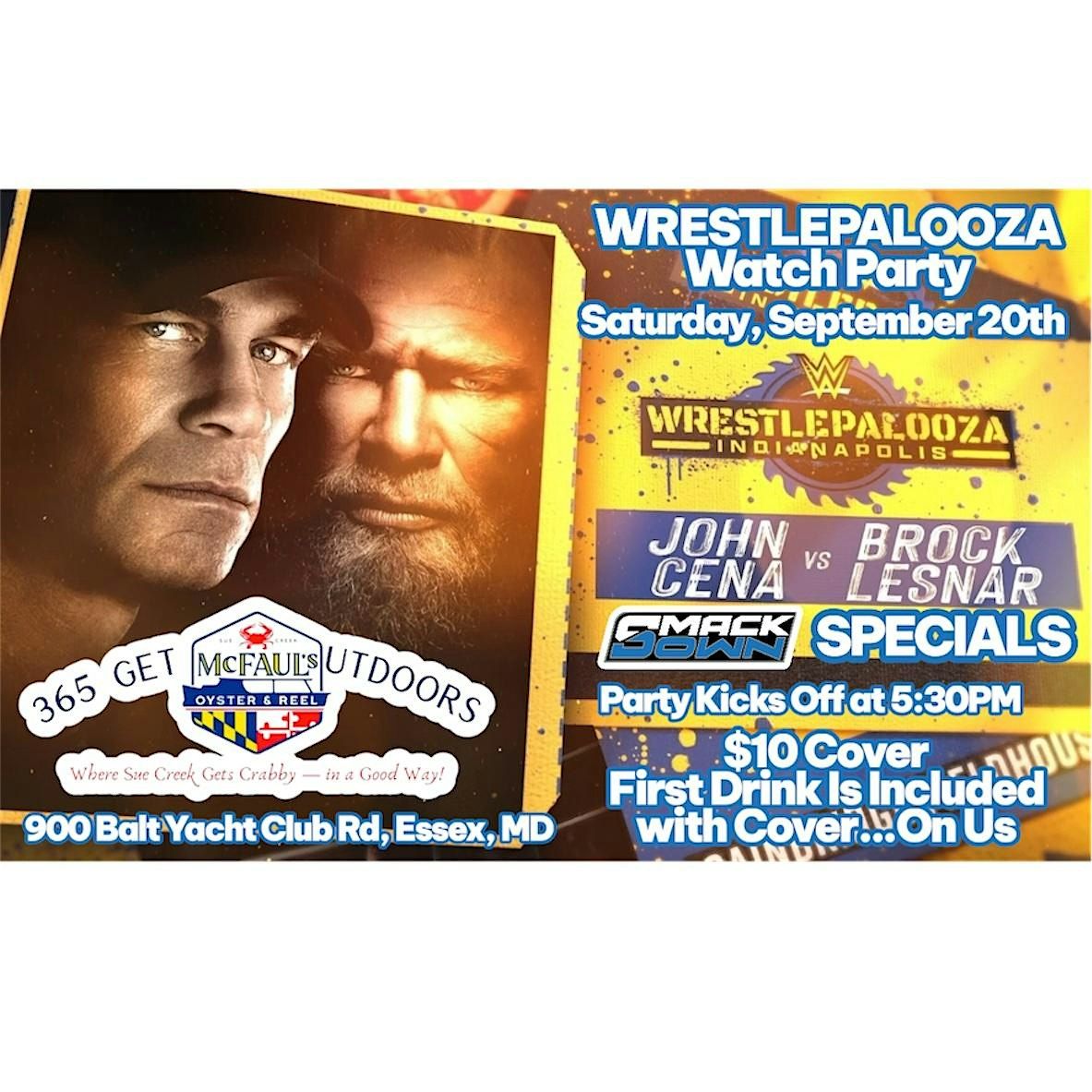 ?♂️WWE UNIVERSE! Don’t want to spend $30 on the New ESPN Ultimate Package to watch WWE PLE’s? That’s alright, we have you covered here at McFaul’s Oyster and Reel ? with a WWE Wrestlepalooza Watch Party. The party starts at 5:30pm with DJ Ryan spinning your favorite WWE Theme Songs along with other music as well. As soon as 7pm hits, the lights shine and the sound is on.