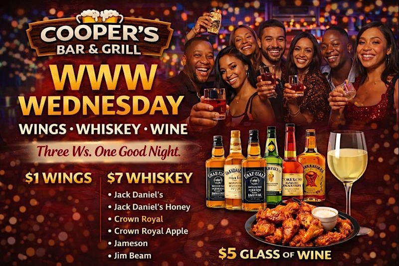 Midweek just got better. Join us every Wednesday at Cooper’s Bar & Grill for WWW Wednesday — a laid-back, high-energy night featuring wings, whiskey, wine, and great vibes.