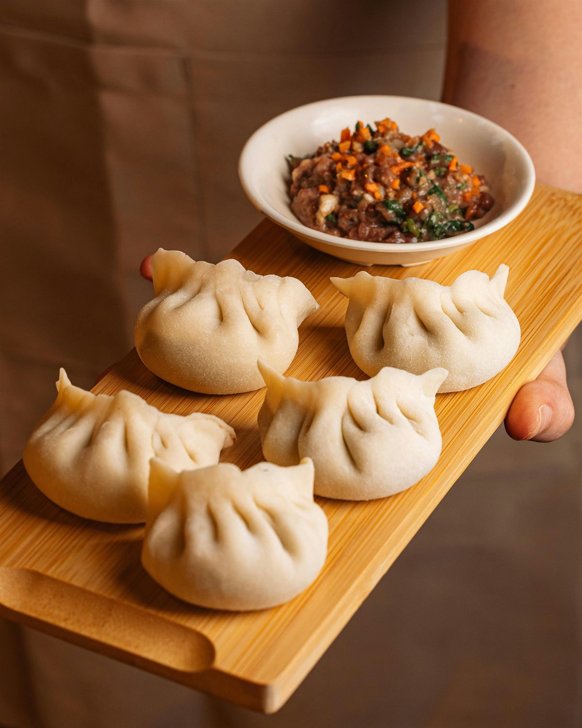 Info: • Guests plate their dumplings and add garnishes or dipping sauces as desired. •