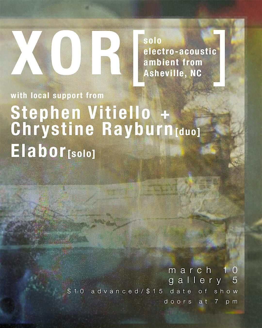 Join us on March 10th for an evening of ambient sonic exploration from Ashville based XOR, and locals Elabor, and Stephen Vitiello + Christine Rayburn with a special duo set.