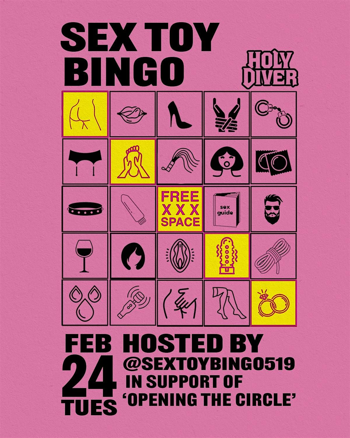 Info: Check in with The Sex Toy Fairy for $CASH at the door. As a OTC Fundraising event we're cutting costs on our electronic payments. Buy as many BINGO cards as you want, with a portion of game proceeds going to Opening The Circle'. Seating is limited to 50 chairs so you are encouraged to purchase online in advance of the event. Our fingers are crossed for another SOLD OUT fundraiser. CUM EARLY and take advantage of the Holy Diver's HAPPY HOUR from 4-8pm. Pro tip: Leave enough time between gnosh and games to wash your hands.