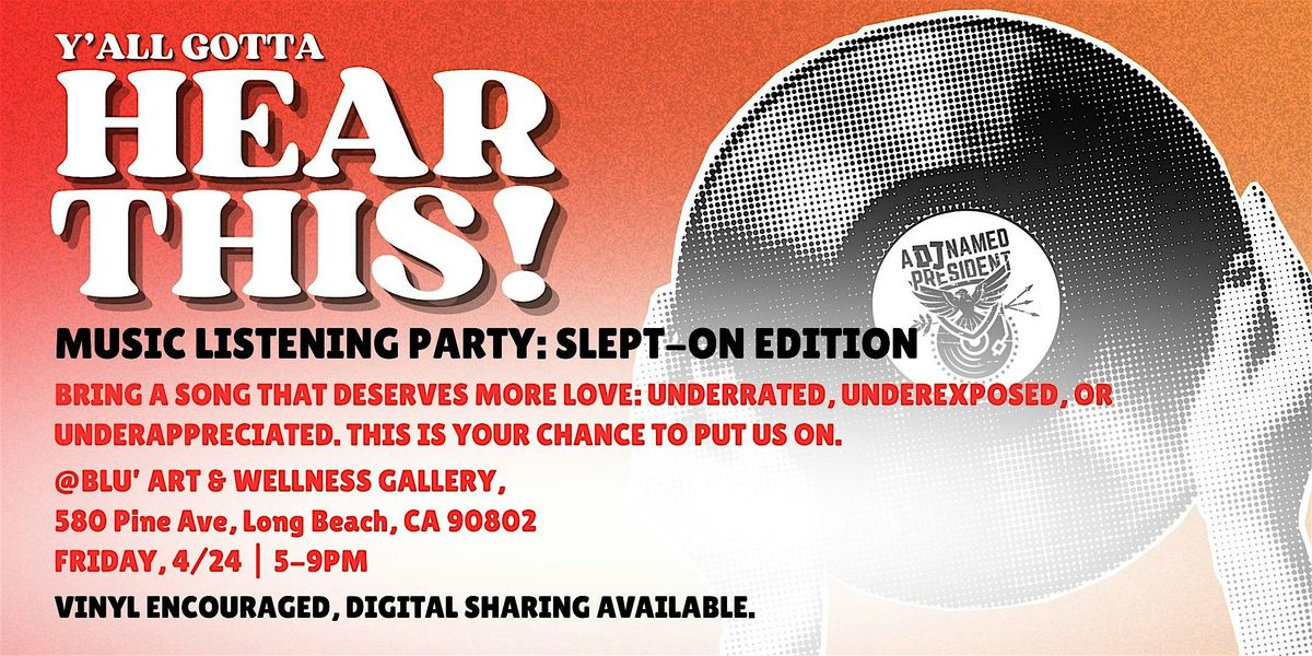 Y’all Gotta Hear This! is a community record listening party presented by A DJ Named President where music lovers gather to share songs they love, this month highlighting songs that have been slept-on. Guests are invited to bring a one song that deserves more love: underrated, underexposed, or underappreciated. This is your chance to put us on!