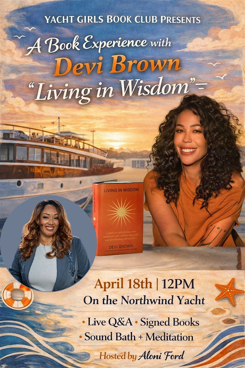 Join the Yacht Girls Book Club for a beautiful and inspiring afternoon aboard a classic 100-foot yacht as we host bestselling author Devi Brown for a special brunch and discussion of her book Living in Wisdom. This will be an intimate and uplifting experience where guests can connect, learn, and enjoy a wonderful day on the water.