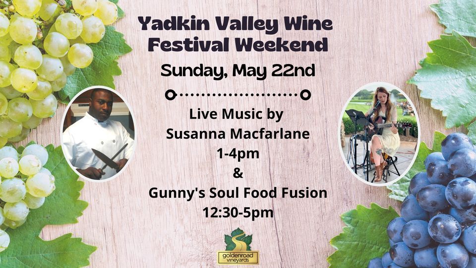 Golden Road Vineyard will keep the party going on Sunday, May 22nd. Come to the vineyard and taste some of the best wine that the Yadkin Valley offers.We will have live music by Susanna Macfarlane and delicious offerings from Gunny's Soul Food Fusion.