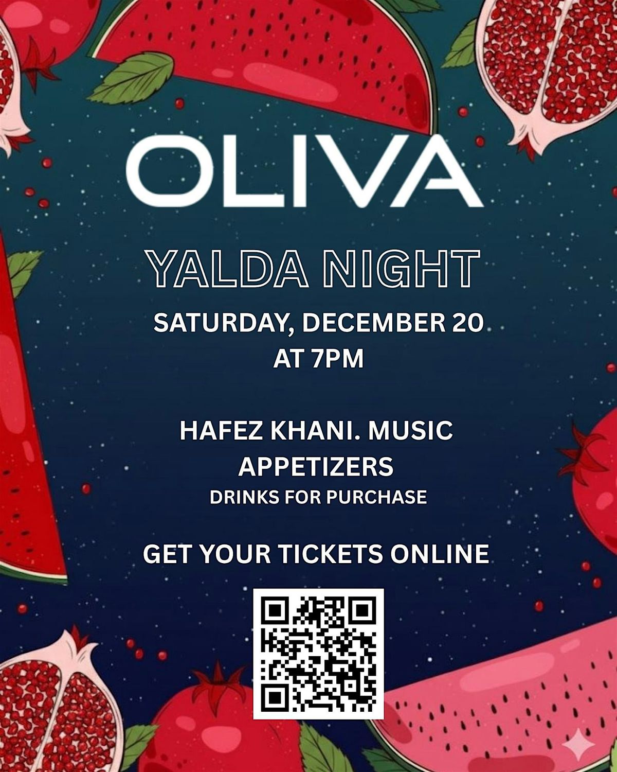 Join us for a warm and elegant Yalda celebration featuring appetizers,Yalda Table, Hafez Khani, and live music. This is a seated event, designed to give every guest a comfortable and enjoyable experience. Drinks are available for purchase.