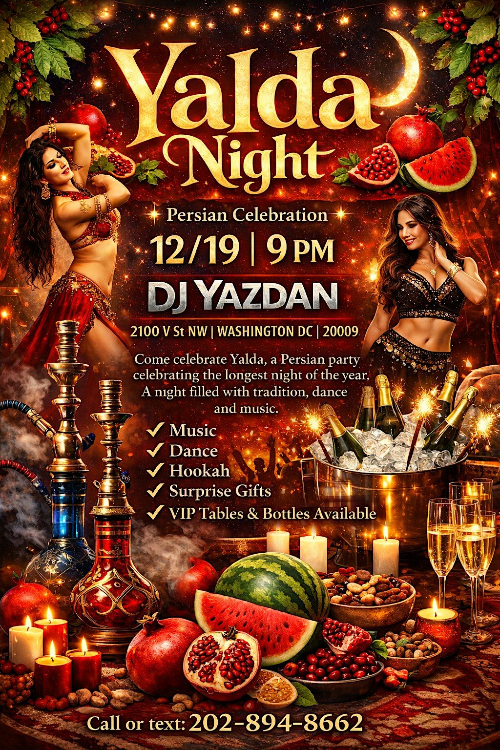 Join us for an unforgettable Yalda Night, the traditional Persian celebration of the longest night of the year! Get ready for a vibrant night filled with music, dancing, tradition, and luxury vibes as we come together to welcome light, joy, and good energy. Expect nonstop dancing, flavorful hookah, surprise gifts, and an electric atmosphere led by DJ Yazdan. This is the Yalda party you don’t want to miss!
