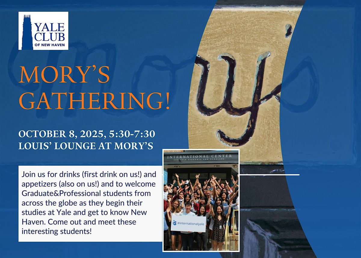 The Yale Club of New Haven monthly Gatherings at Mory's begin on Wednesday, October 8, 2025, from 5:30 PM to 7:30 PM.