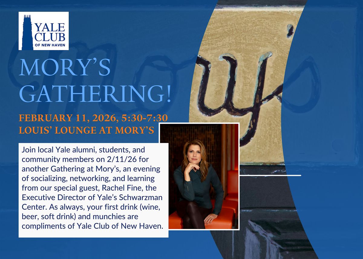Join local Yale alumni, students, and community members on 2/11/26 for another Gathering at Mory’s, an evening of socializing, networking, and learning from our special guest, Rachel Fine, the Executive Director of Yale’s Schwarzman Center.