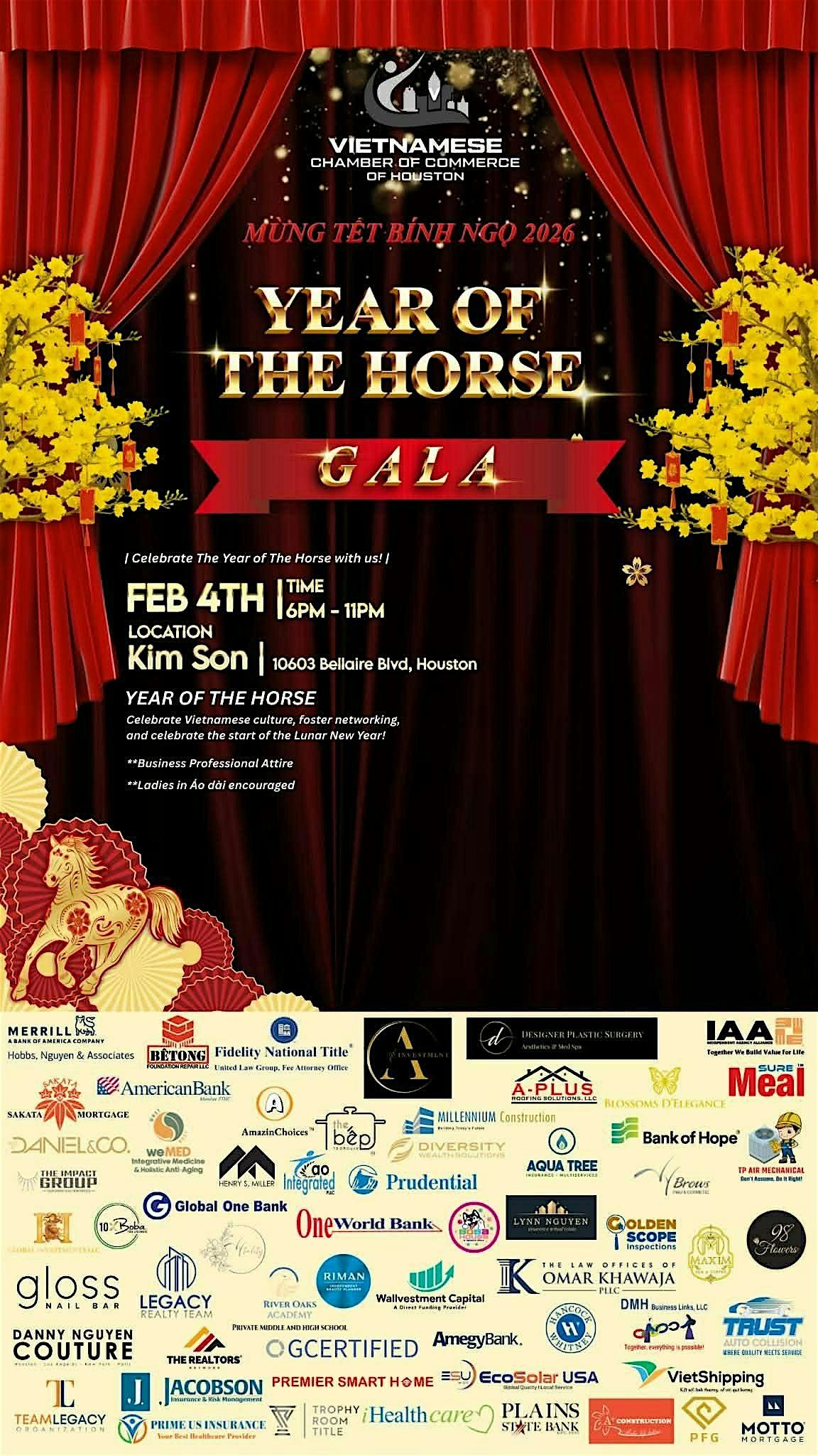 Welcome to the Year of the Horse Gala hosted by the Vietnamese Chamber of Commerce! Join us for a night of networking and celebration at Kim Son on February 4, 2026 at 6:00 PM (Central Time). Connect with fellow professionals, enjoy delicious food, and immerse yourself in the vibrant culture. Don't miss this opportunity to expand your network and have a great time! See you there!