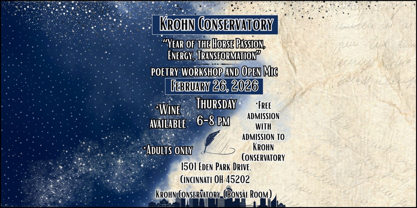 “Awaken, Ignite, Illuminate” at Krohn Conservatory is a three-part writing workshop and open mic series inspired by the Year of the Horse, an emblem of passion, momentum, and bold transformation. Set within nature’s living architecture, this experience invites writers to move with the rhythm of change as it mirrors the human journey. The series begins with awakening,light returning after darkness, then surges forward with fire, movement, and untamed energy, urging voices to run free. It culminates in a luminous, moonlit realm where reflection, shadow, and quiet power reveal beauty in stillness. From first spark to radiant transformation, Awaken, Ignite, Illuminate honors the courage to become, evolve, and shine in every phase.