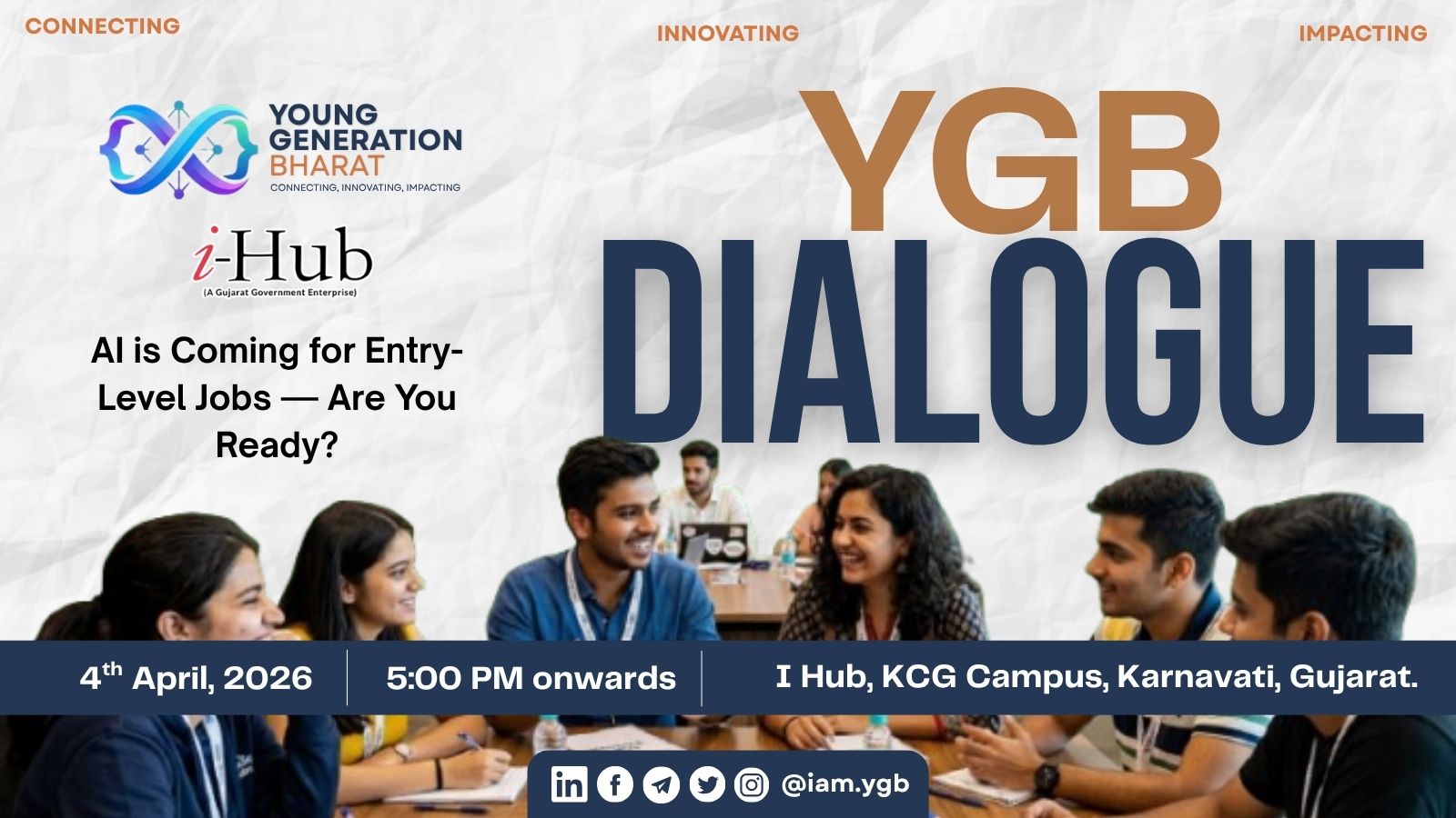 Unlock the gateway to inspiration and enlightenment at YGB Dialogue, hosted by YGB. Join us on April 4th, 2026, at 5:00 PM in the vibrant setting of I Hub, KCG Campus, Karnavati.
