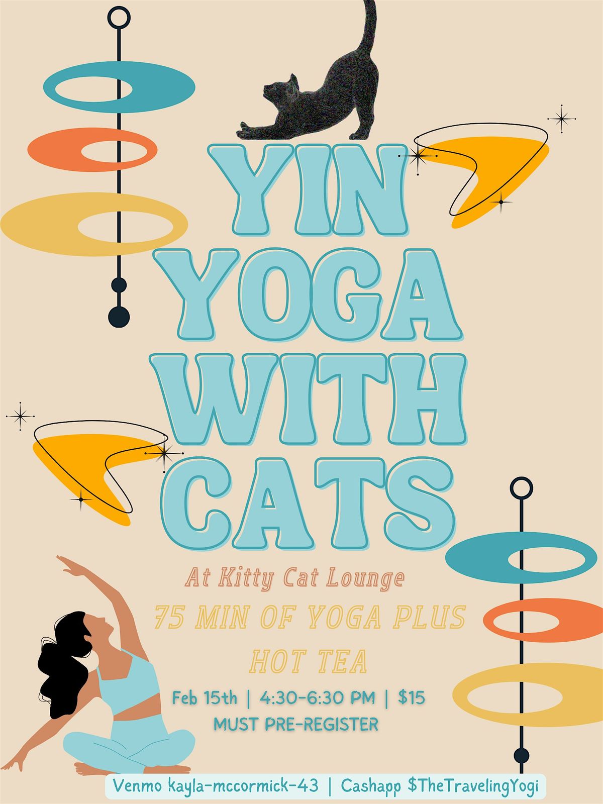 75 min of yin yoga. Cat time and Hot tea included