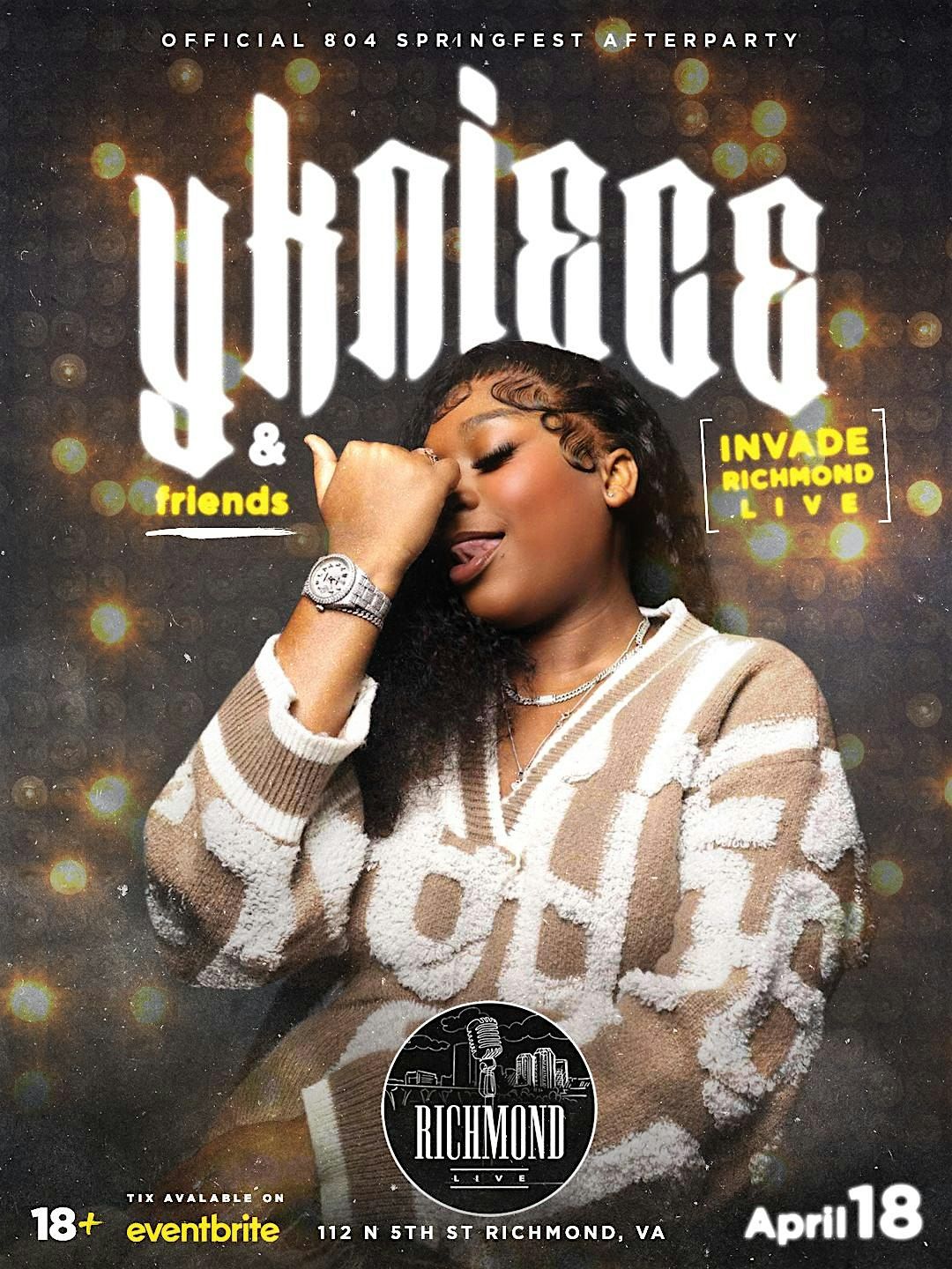 Get ready for the 804 SpringFest Official Afterparty with YK Niece taking over Richmond Live! Join us on April 18, 2026 at 10:00 PM (Eastern Time) for a night full of energy, great vibes, and unforgettable music. Don’t miss out on this epic afterparty to keep the SpringFest spirit alive. Bring your crew and let’s make it a night to remember!