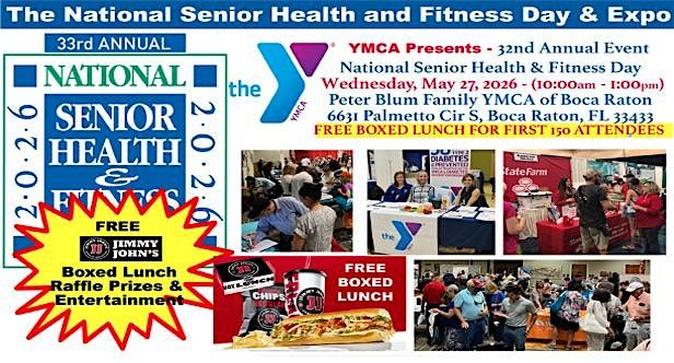 Wednesday, May 27, 2026 (10:00am - 12:00pm) 33rd Annual National Senior Health & Expo the YMCA Boca Raton (FREE Jimmy John's Boxed Lunch)About this Event