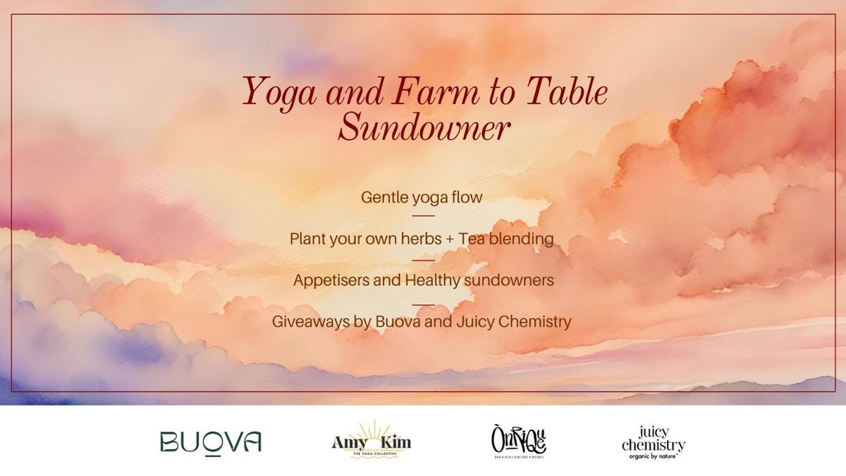 Yoga and Farm-to-Table SundownerExperience a relaxing and rejuvenating evening that blends wellness, nature, and mindful indulgence. This carefully curated event offers a unique way to unwind, connect with nature, and nourish both body and mind.What to expect:Gentle Yoga Flow – A calming yoga session suitable for all levels, designed to relax your body and mind.Plant Your Own Herbs + Tea Blending – Engage with nature hands-on by planting your own herbs and creating a custom tea blend.Appetisers & Healthy Sundowners – Savour delicious, nourishing bites and refreshing beverages crafted to delight your senses.Giveaways by Buova and Juicy Chemistry – Receive wellness goodies to take the experience home with you.Hosted and partnered by Buova, Amy Kim – The Yoga Collective, Onrique, and Juicy Chemistry, this sundowner is designed to help you slow down, embrace mindfulness, and enjoy a peaceful evening in great company.It’s the perfect way to connect with nature, rejuvenate your spirit, and end the day on a serene, uplifting note.