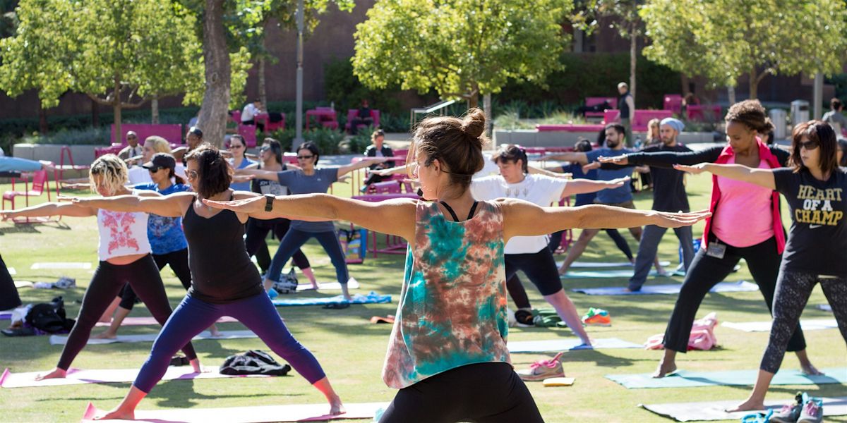 - In-Person yoga classes for all-levels on Wednesdays and Fridays, from 12:00 – 12:45 p.m., located on the scenic performance lawn (between Grand Ave and Hill St).