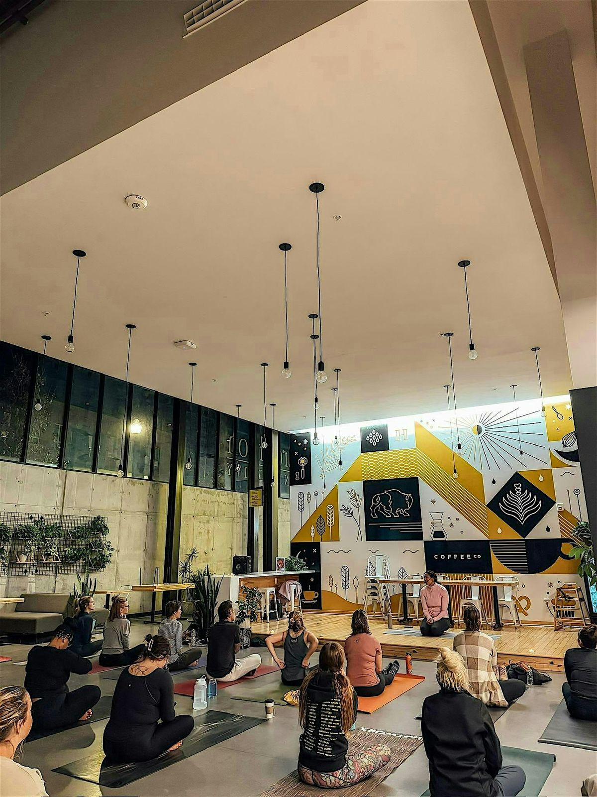 We’ll move the tables and chairs out of the way, light some candles, deep clean the floor, and invite you to bring your yoga mat and a friend for an evening of relaxation, movement, hot drinks, and connection.