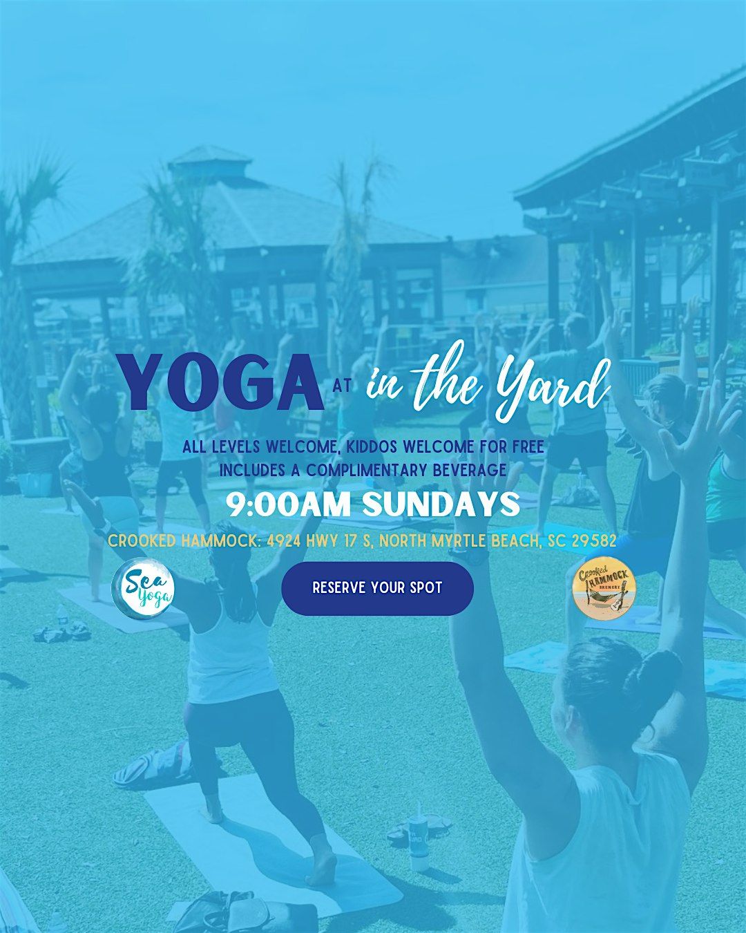 Join Sea Yoga each Sunday at 9am in the yard at Crooked Hammock! Each week we alternate between slow flow or yin yoga! All levels welcome! Kids flow free! Your ticket includes a complentary draft, mimosa, or non alcoholic beverage for after class! Stay for Crooked Hammock's fabulous brunch after class! Mats available for use during class with at least 24 hours notice by texting 843-605-1751.