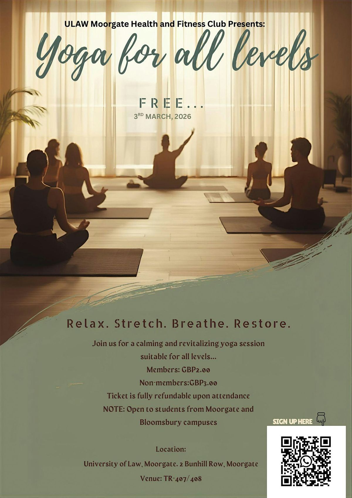 Hey there! Join us for a relaxing yoga session exclusively for ULaw students from both the Moorgate and Bloomsbury campuses. It’s a great way to unwind, stretch out, and meet fellow students.