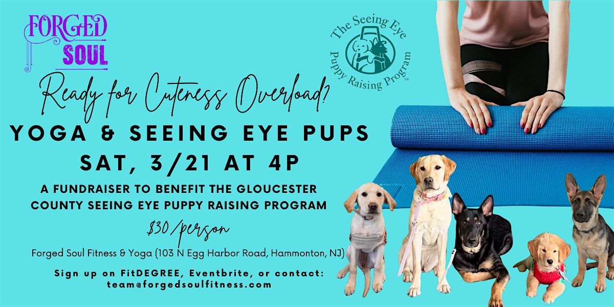 Join Michelle on Saturday, March 21st at 4pm for a beginner friendly yoga class with puppies from the Gloucester County Seeing Eye Puppy Raising Program!