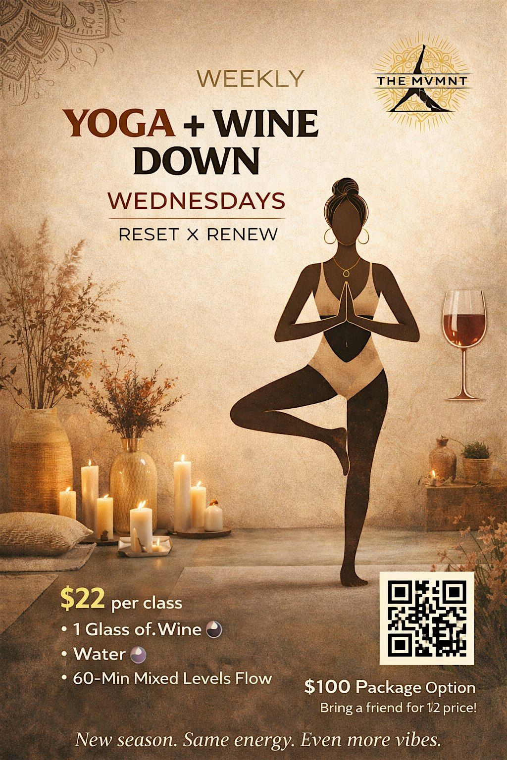 Midweek reset @The_ MVMNT. 60min. Mixed Levels Flow with complimentary wine + community. Move, Breathe, Connect...Join THE MVMNT! (18+yrs)