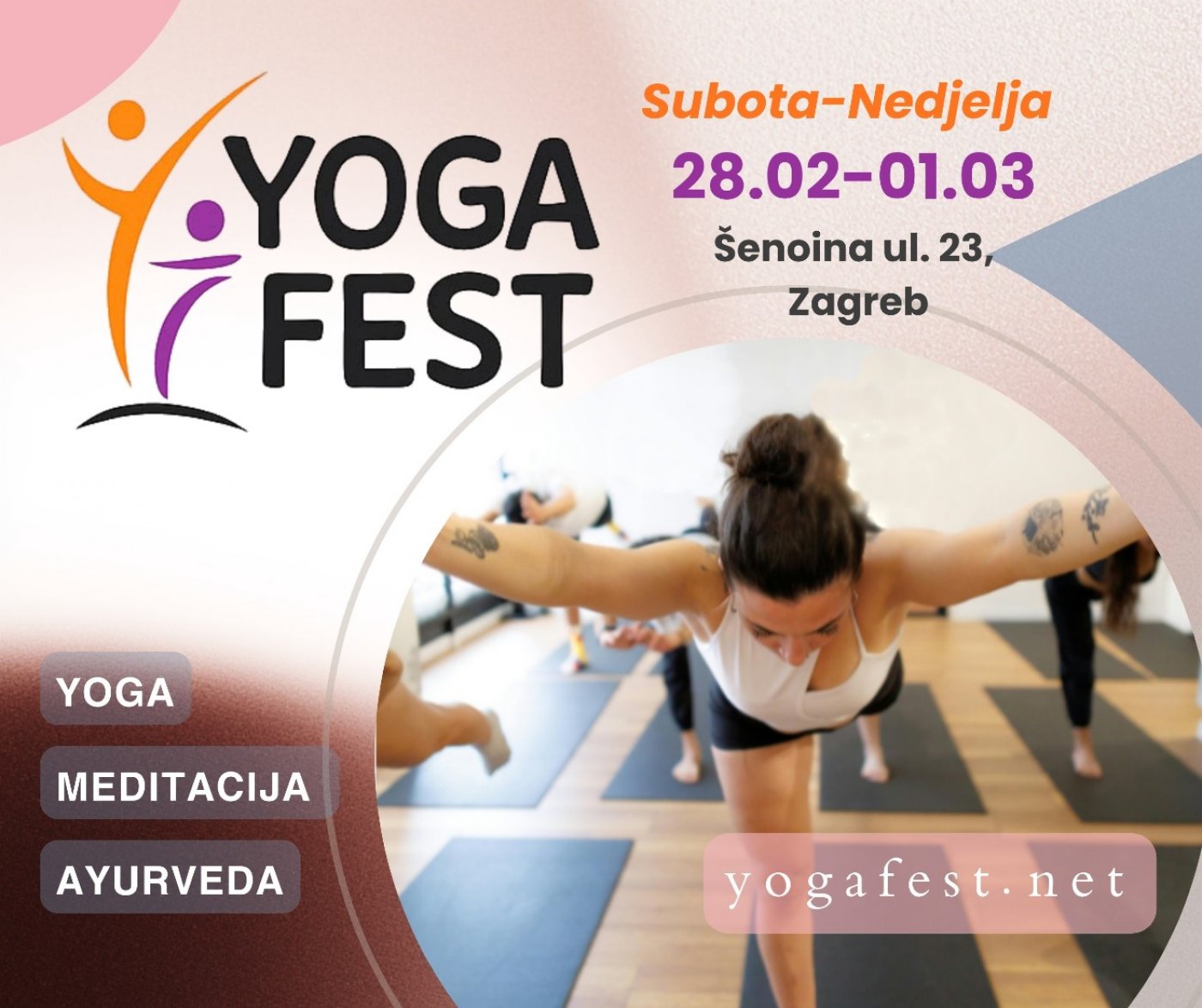 Pozivamo vas na dvodnevni Yoga Fest, vikend posvećen yogi, zdravom načinu života i svjesnom povezivanju tijela, uma i duha. Kroz raznolike stilove yoge, radionice, predavanja i glazbene programe, festival okuplja ljubitelje yoge, holističkog zdravlja i duhovne prakse.
