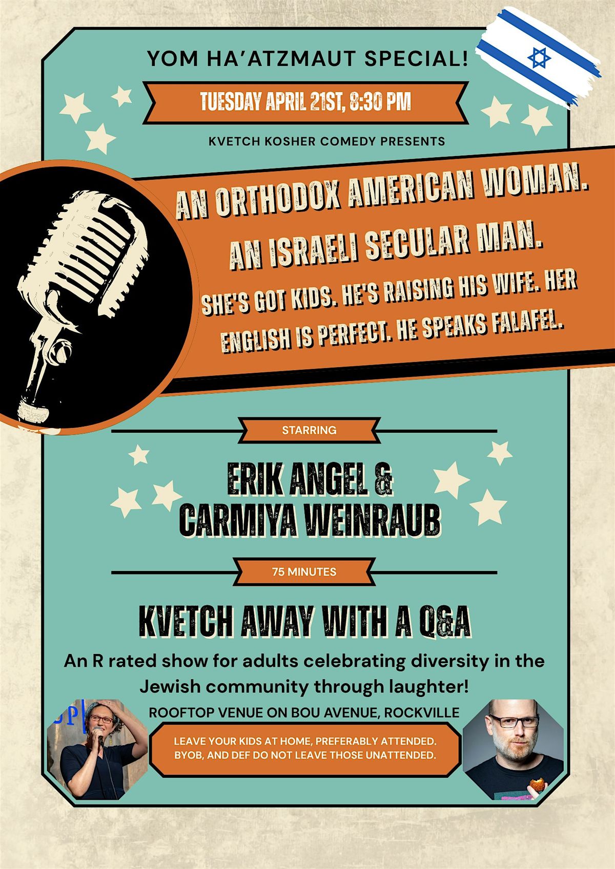 BYOB and leave your kids at home, And join us in welcoming Israel's Independence day! Featuring the hilarious Erik Angel & Carmiya Weinraub!