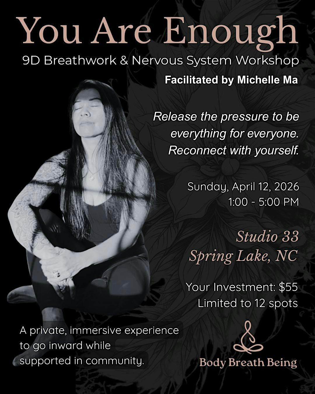 You Are Enough is a guided breathwork and nervous system workshop designed for those who carry a lot—responsibility, pressure, expectations—and still find themselves questioning if they’re doing enough or being enough.