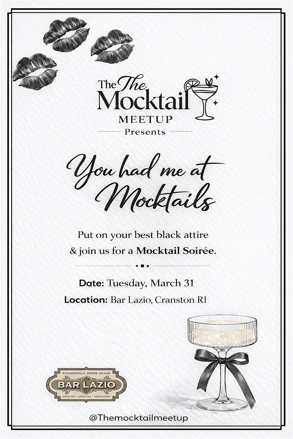 Mocktails & classy vibes. Dress in black & come sip with us! Ticket incl. entry to party, bites by Bar Lazio & 1 raffle entry.