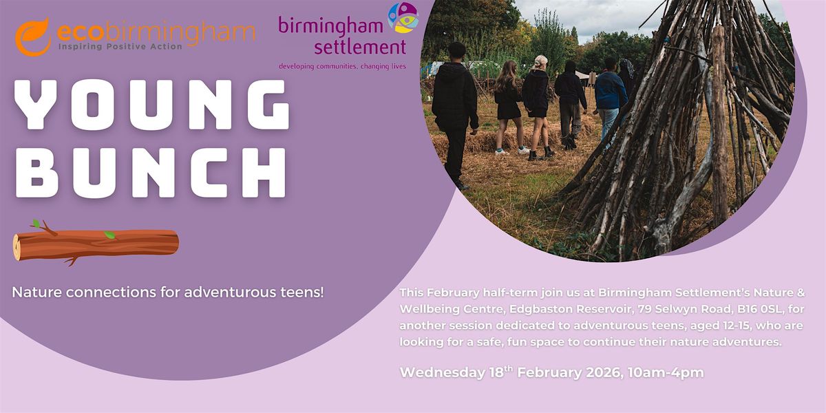 We're thrilled to continue our partnership with Birmingham Settlement and call all adventurous teens aged 12-15 to join us at their fantastic Nature & Wellbeing Centre by the Edgbaston Reservoir for another unique day spent close to nature, the Young Bunch!