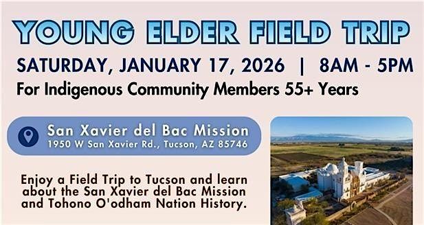 Greetings Young Elders! Join us on January 17th for an Elders Field Trip! We’ll be traveling to the San Xavier del Bac Mission in Tucson, AZ to learn more about the Mission, as well as Tohono O'odham culture. We will also be visiting the San Xavier Co-Op Farm for a tour and lunch. Only 1 registration per person. Limited registration.