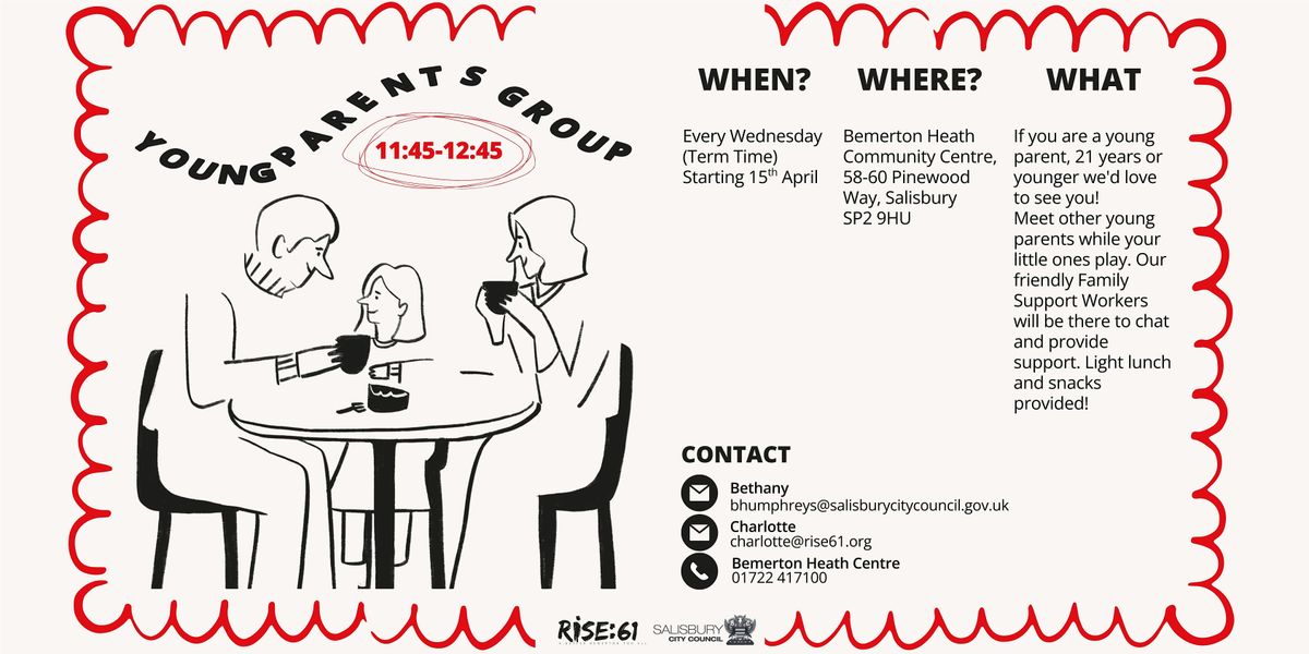 Young Parents Group (21 & under)! Starts Wed 15th April, 11:45-12:45 at Bemerton Heath Centre. Free lunch, play & support. Scan to join us!